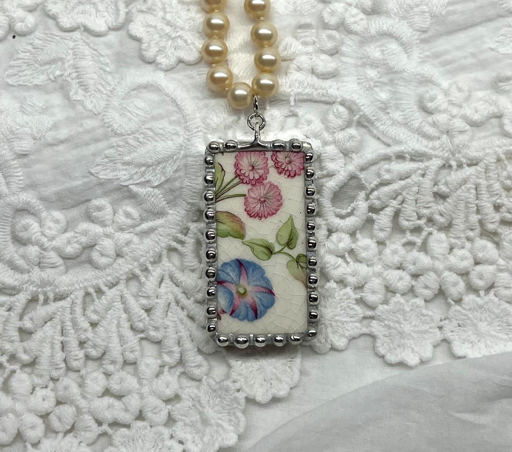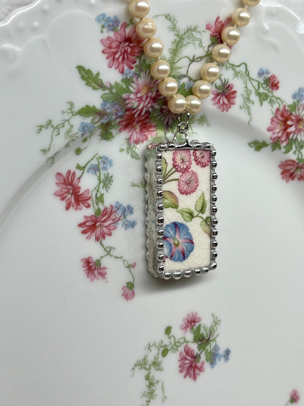 Beautiful purple, blue and pink floral pendant made from a stunning, vintage 1934 Cronin China platter. Due to its age, this piece has some incredible crazing which adds to its beauty. The Cronin China company was in in Minerva, Ohio and ceased operation in 1956. This piece is lovingly hand cut, ground and shaped, then soldered around the edges with lead free solder (97% tin and 3% copper).