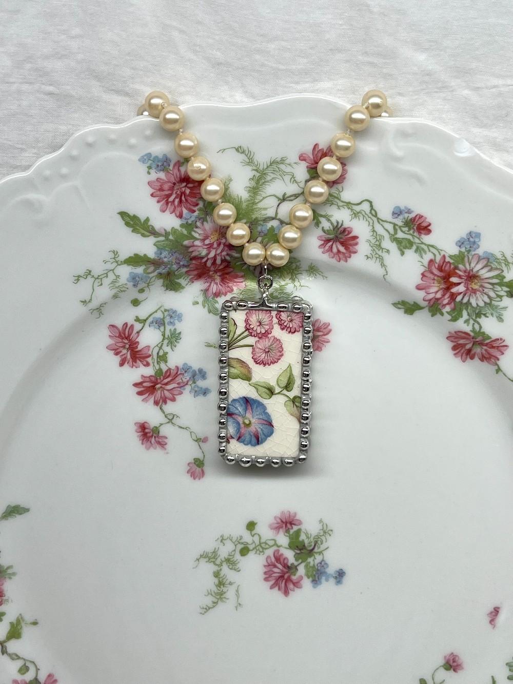 Vintage Broken Cronin China Floral Pendant with vintage faux pearl Necklace